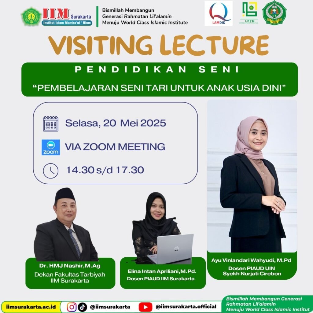 Prodi PIAUD IIM Surakarta Gelar Kuliah Tamu Bersama Prodi PIAUD UIN Syekh Nurjati Cirebon: Kupas Pembelajaran Seni Tari untuk Anak Usia Dini Surakarta, 20 Mei 2025 — Program Studi Pendidikan Islam Anak Usia Dini (PIAUD) Institut Islam Mamba’ul ‘Ulum (IIM) Surakarta kembali menyelenggarakan kuliah tamu yang kali ini berkolaborasi dengan Prodi PIAUD Universitas Islam Negeri